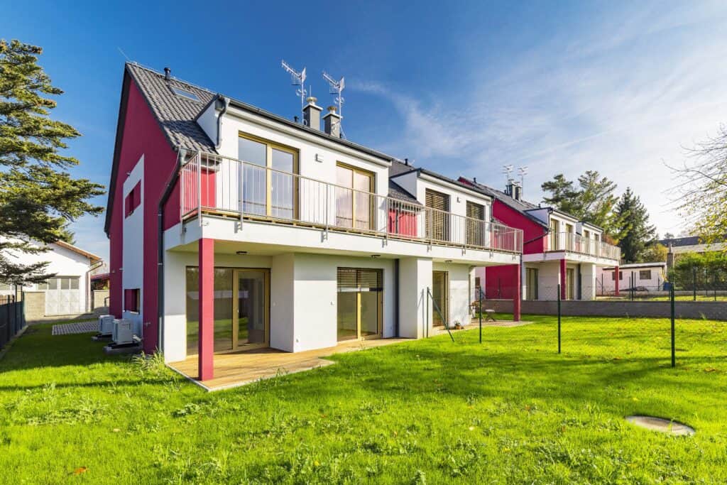 Výstavba dvou rodinných domů, z nichž každý obsahuje dvě samostatné bytové jednotky s vlastním vstupem, zahradou a parkovací stání.